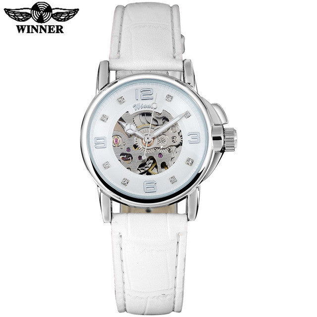 2016 WINNER popular brand women watches luxury automatic self wind watch skeleton dial transparent glass gold case leather band