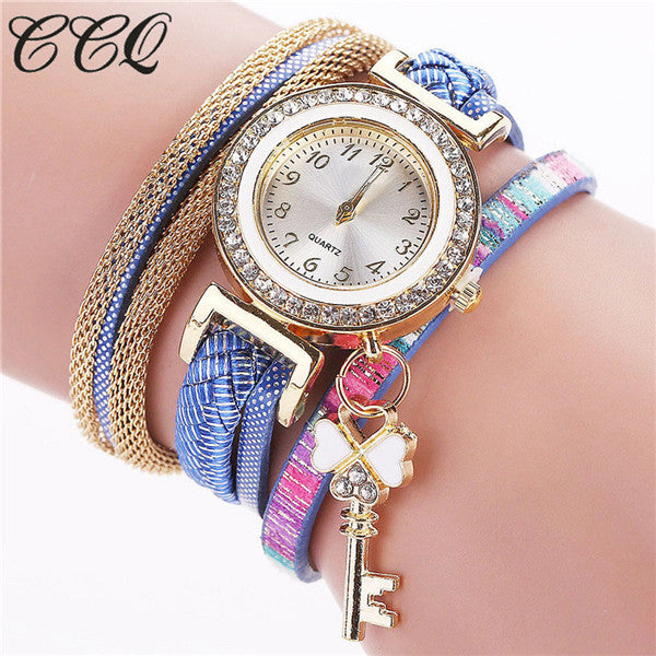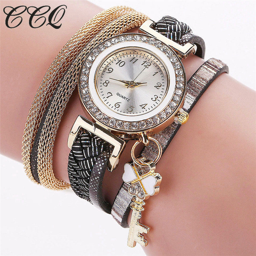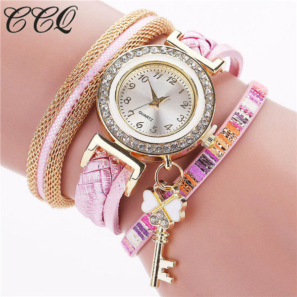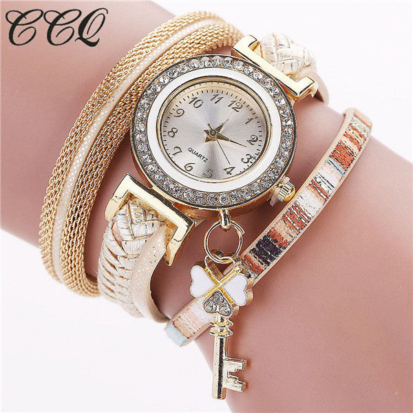 2017 New Fashion Gold Luxury Crystal Key Watch Casual Women Bracelet Watch Leather